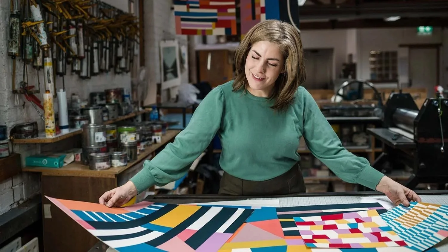 Maria Atanacković with some of her colourful abstract fine art screen prints at Graphic Studio Dublin
